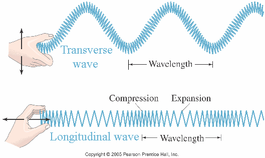 - To understand transverse waves, think of a spring or rope. If the spring is pulled reasonably tight, and you tap down on the spring at one end, then the effect of the tap will travel along the spring. The effect of the tap was to move the coils of the spring up or down (or left to right) a few millimetres. The tension in the spring quickly pulled the coils back into line. However, the first few coils pulled their neighbours out of line so they moved up, then down... and so on. Notice that the tap made the coils move at right angles to the spring while the ripple moved along the spring. The two motions are at right angles to each other. For this reason, we call this a transverse wave.